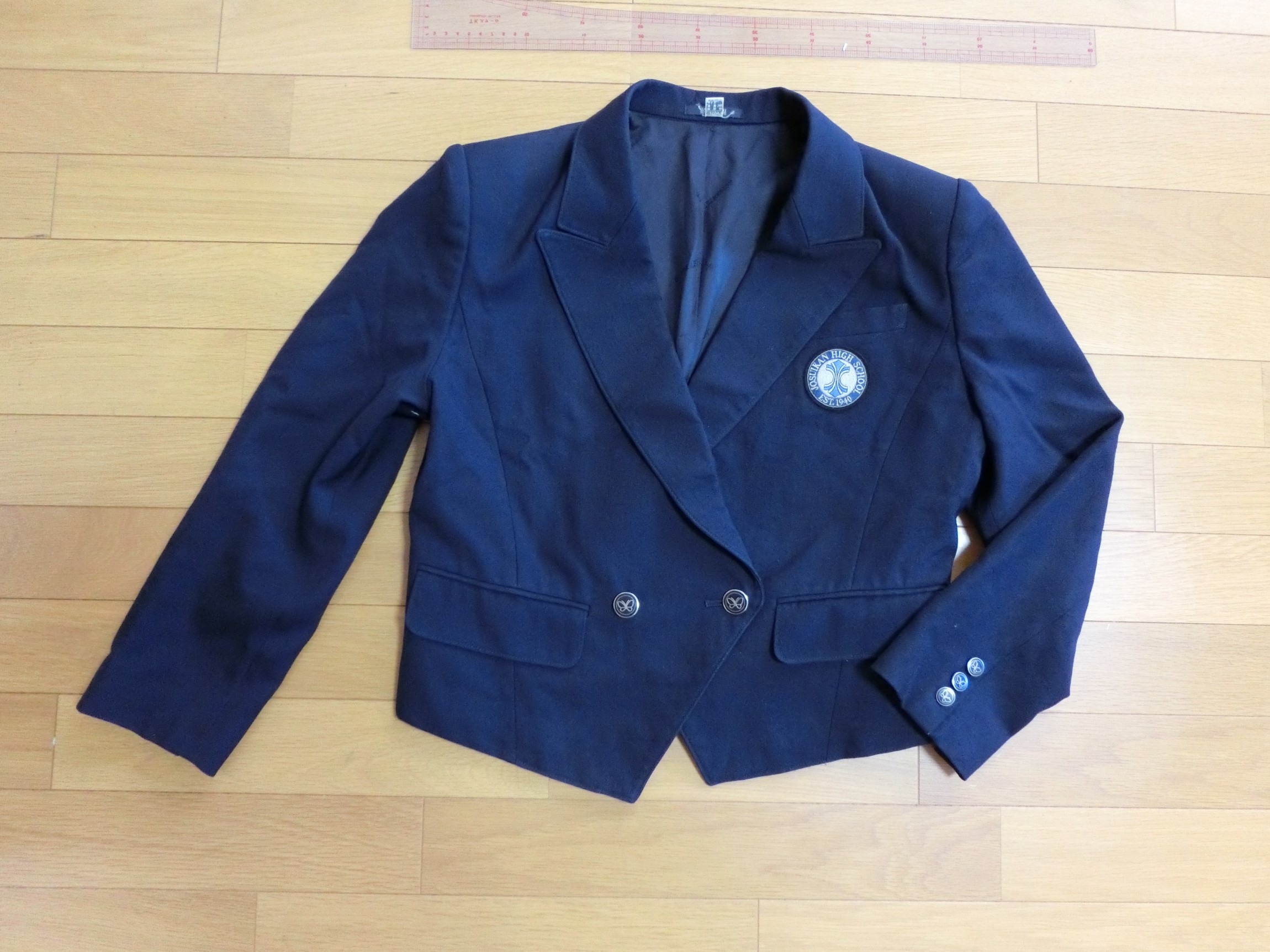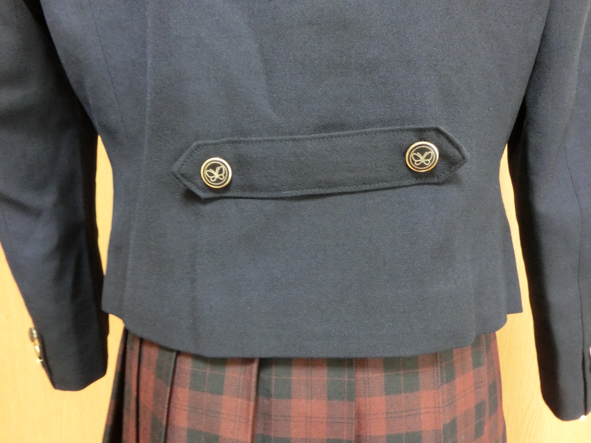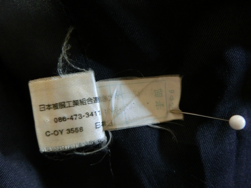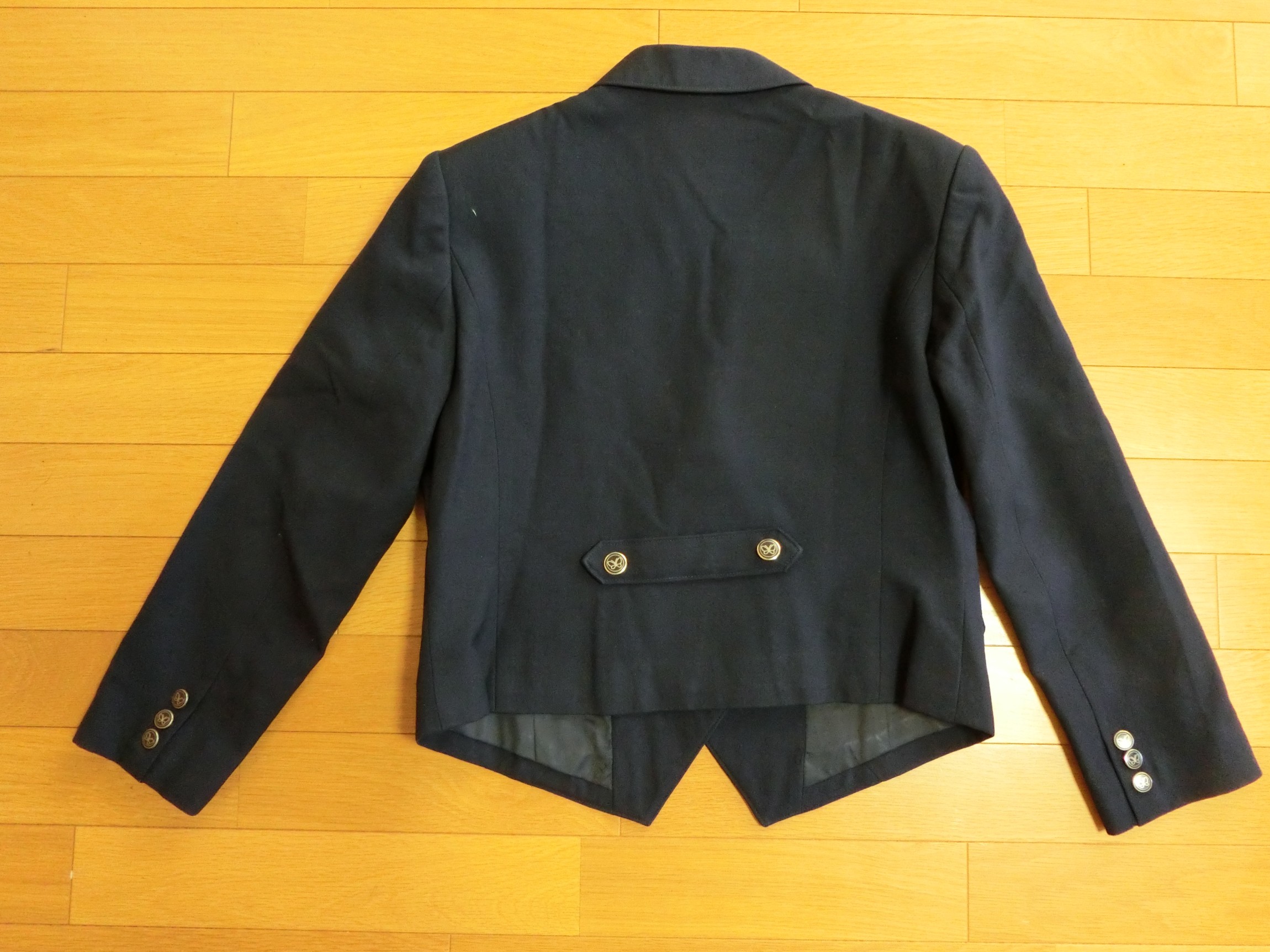森英恵ブレザーのバージョンで、ラペルの先が剣のようにとがって上向きになっているピークトラペルで 裾の丈が短くて合わせ角なっタイプ