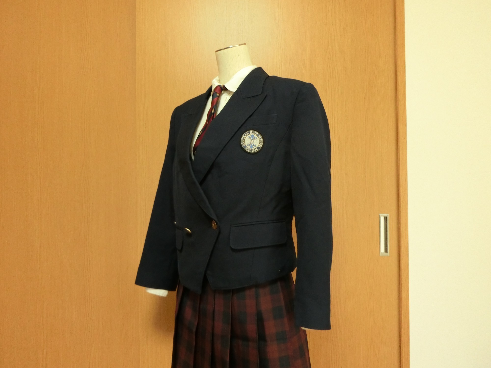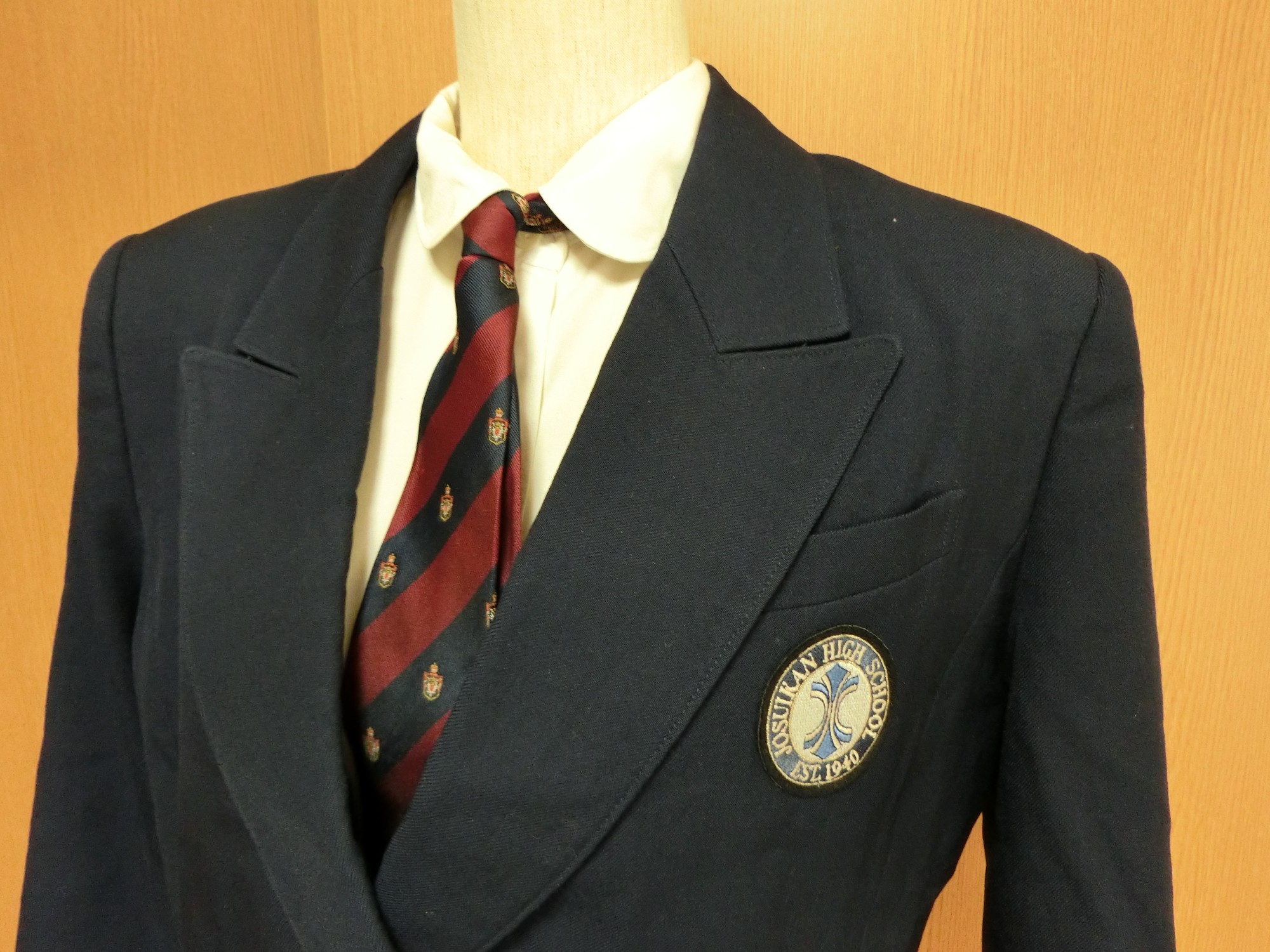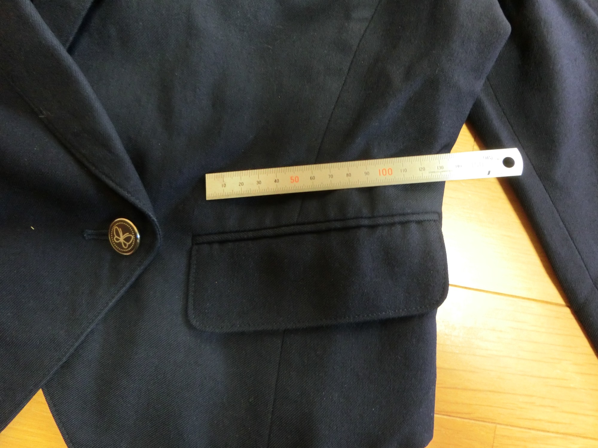 森英恵ブレザーのバージョンで、ラペルの先が剣のようにとがって上向きになっているピークトラペルで 裾の丈が短くて合わせ角なっタイプ