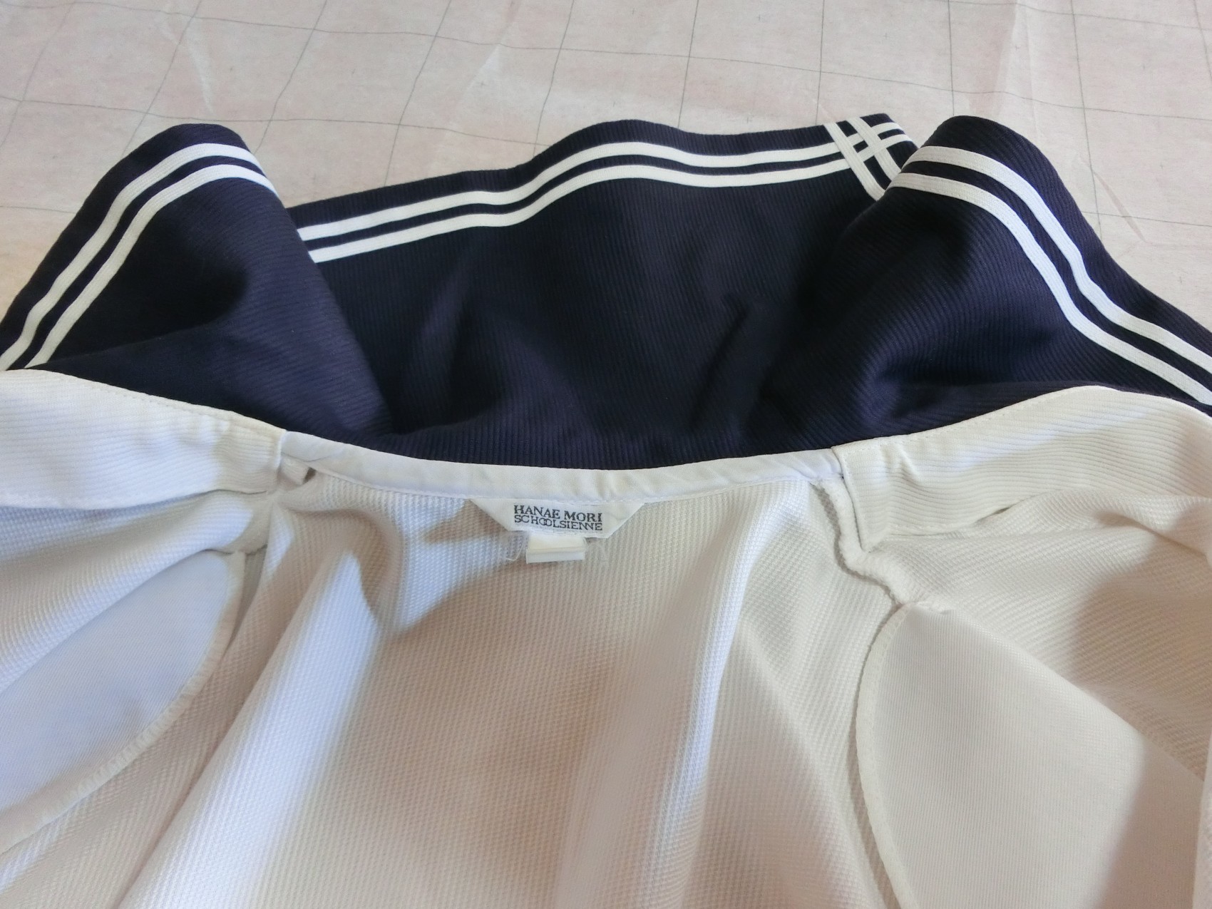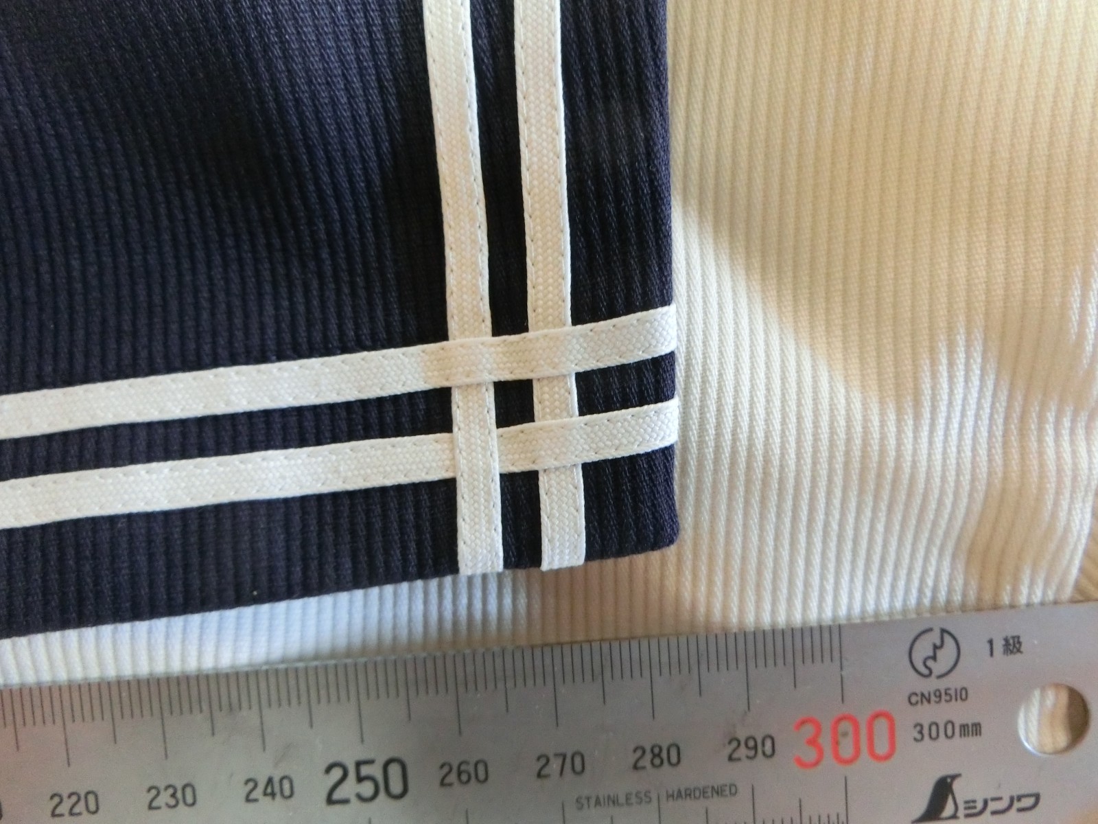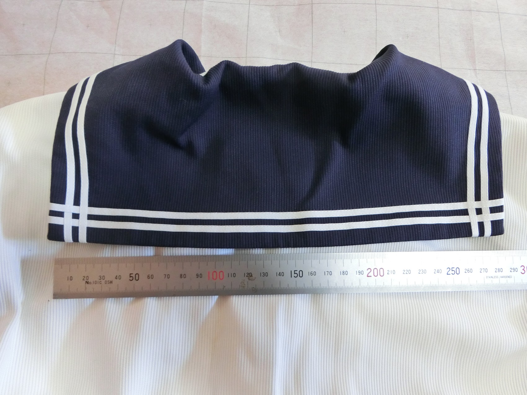 二本ラインを井形に重ねて縫っています 裏面も紺色地です 肩ダーツなし