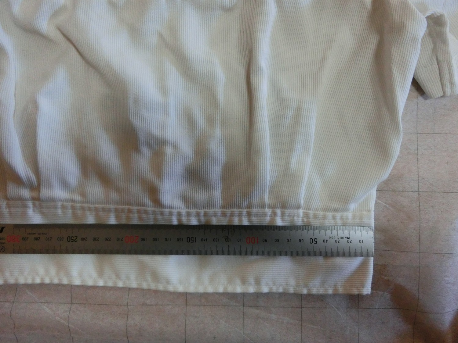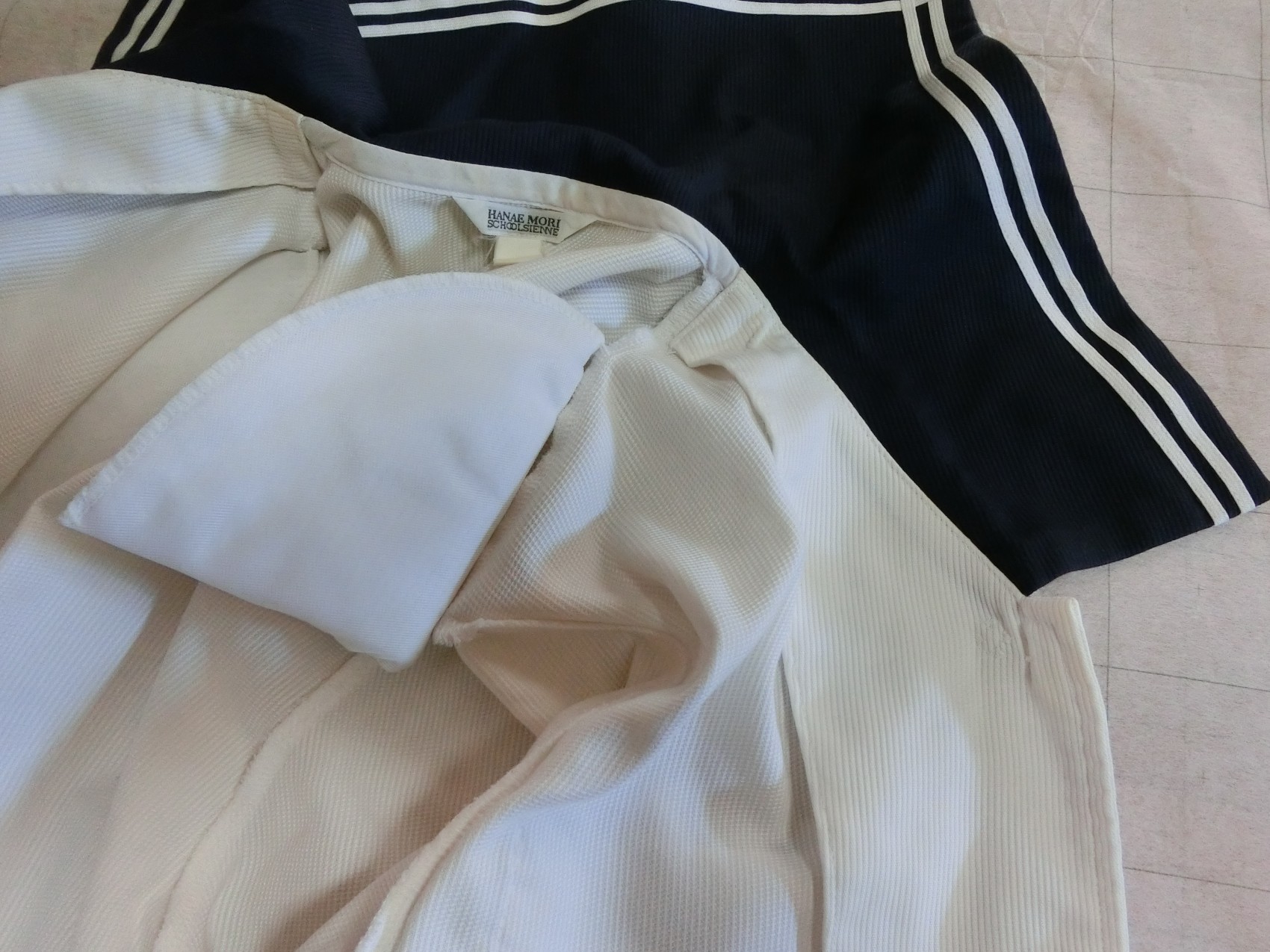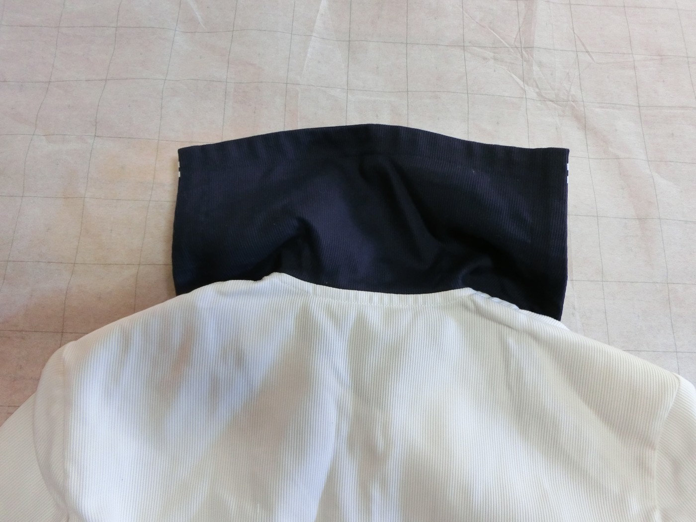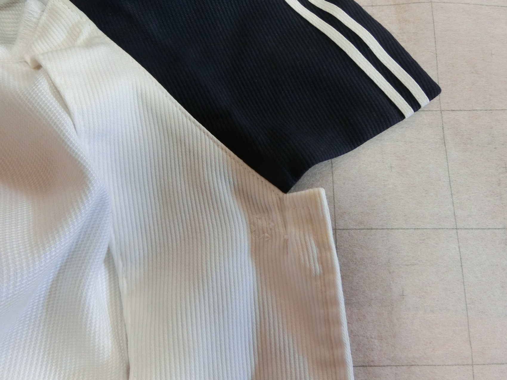 二本ラインを井形に重ねて縫っています 裏面も紺色地です 肩ダーツなし