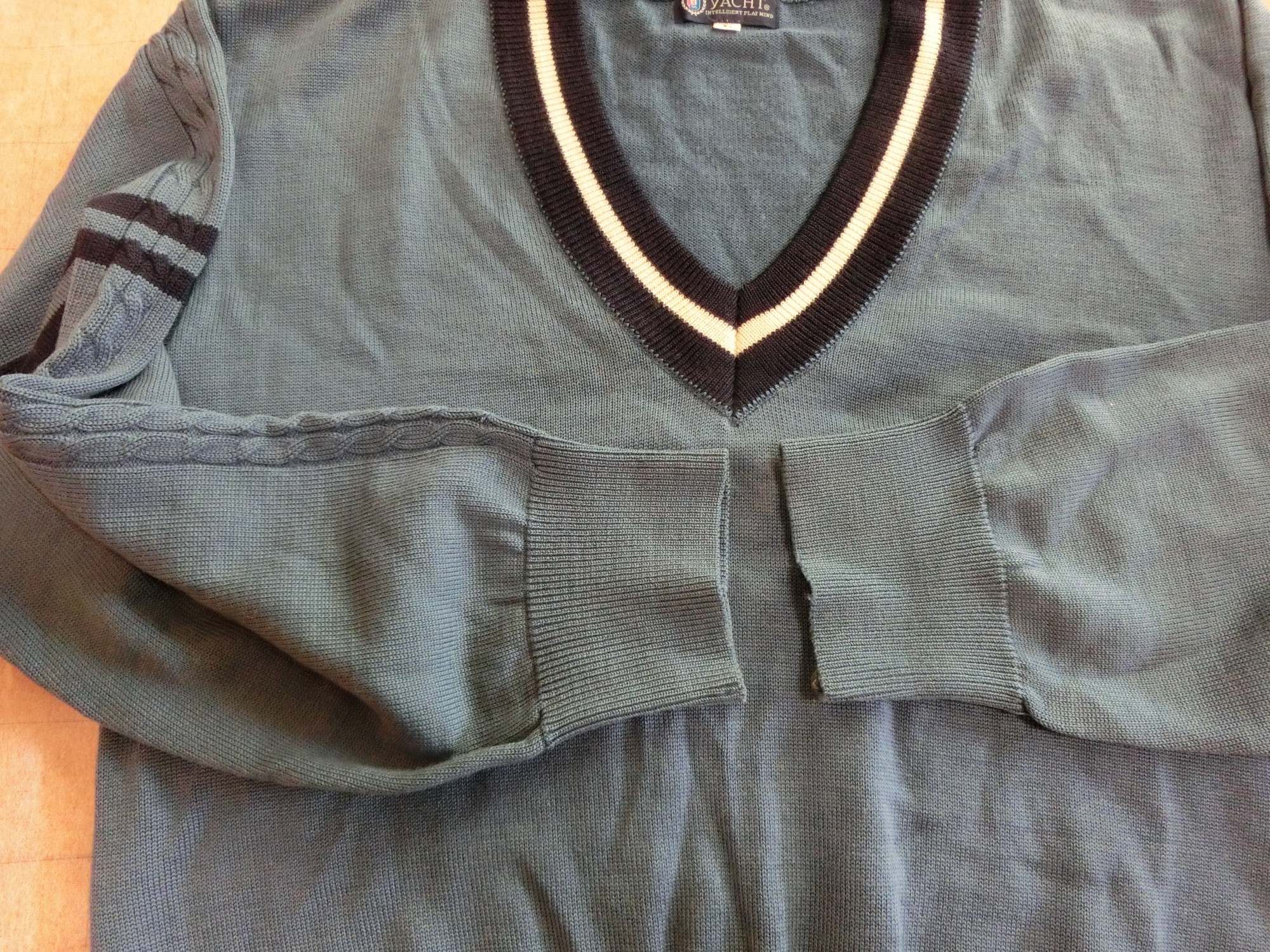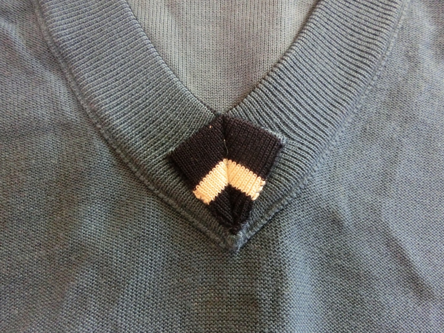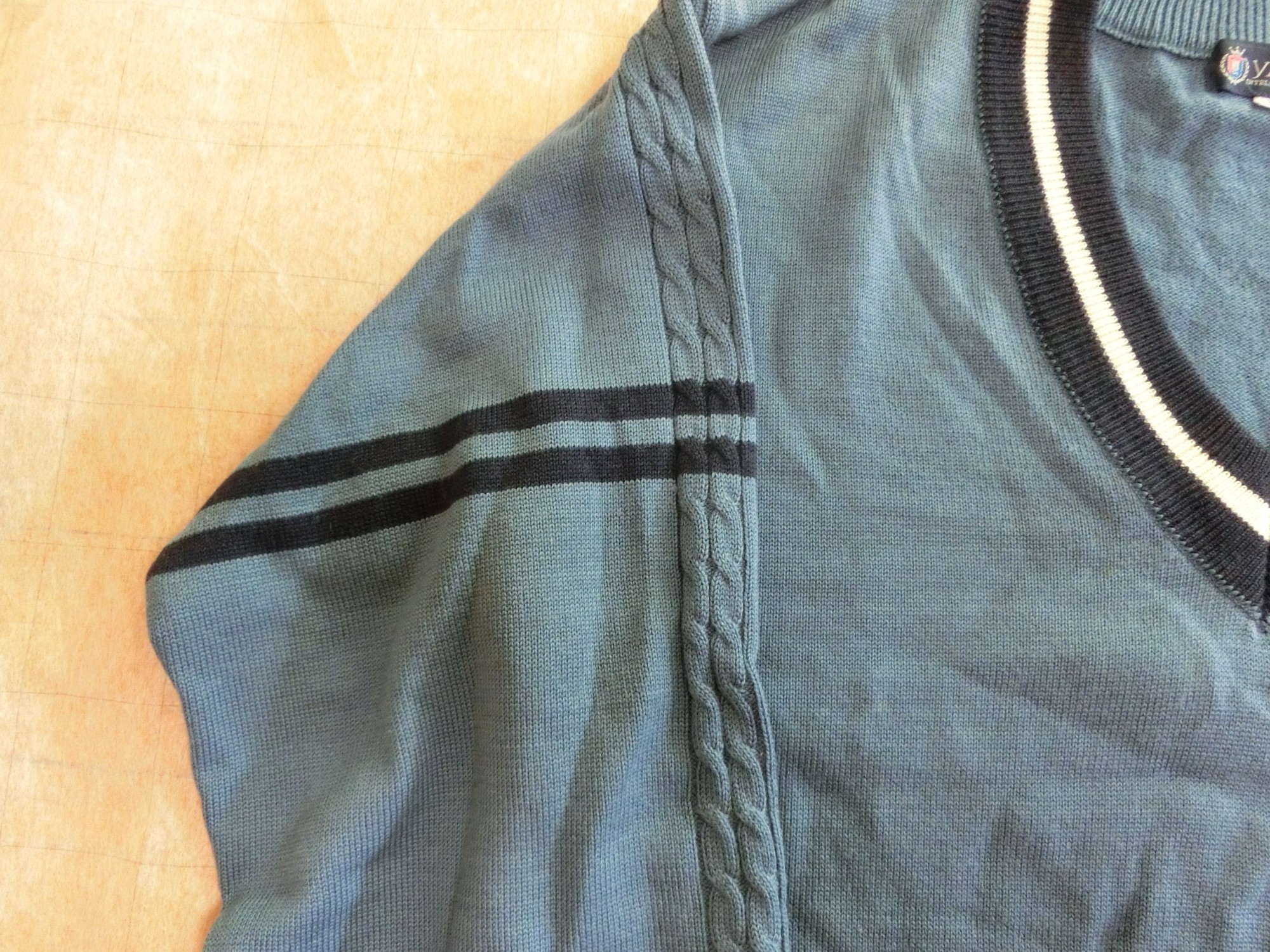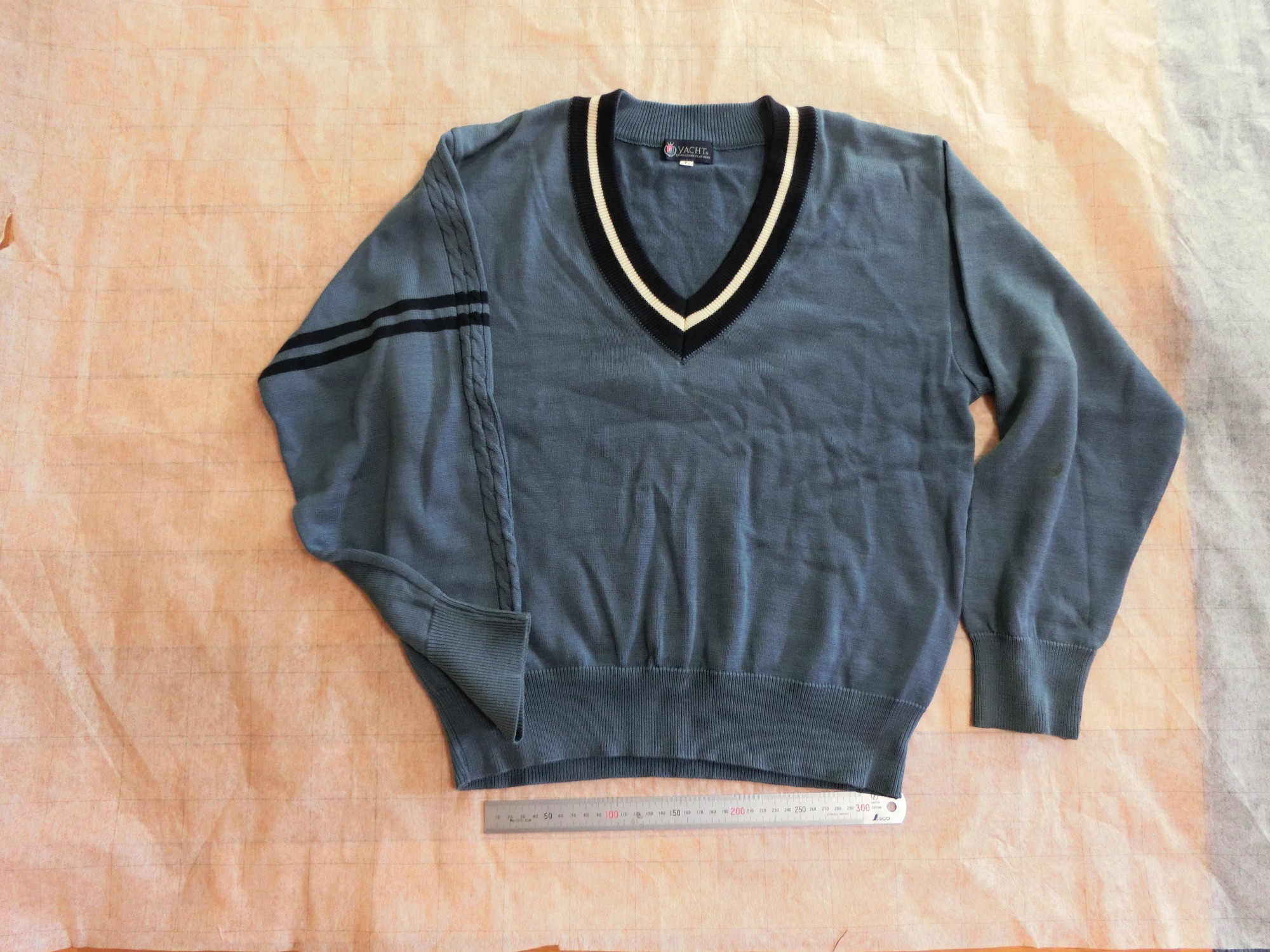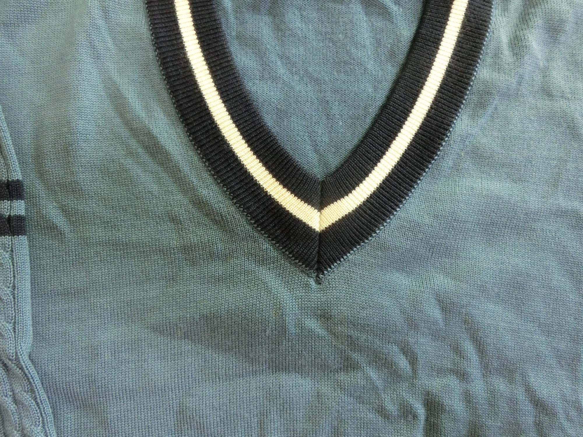 色はブレザーと同じブルー ネックラインが黒で白いラインが1本入ってます