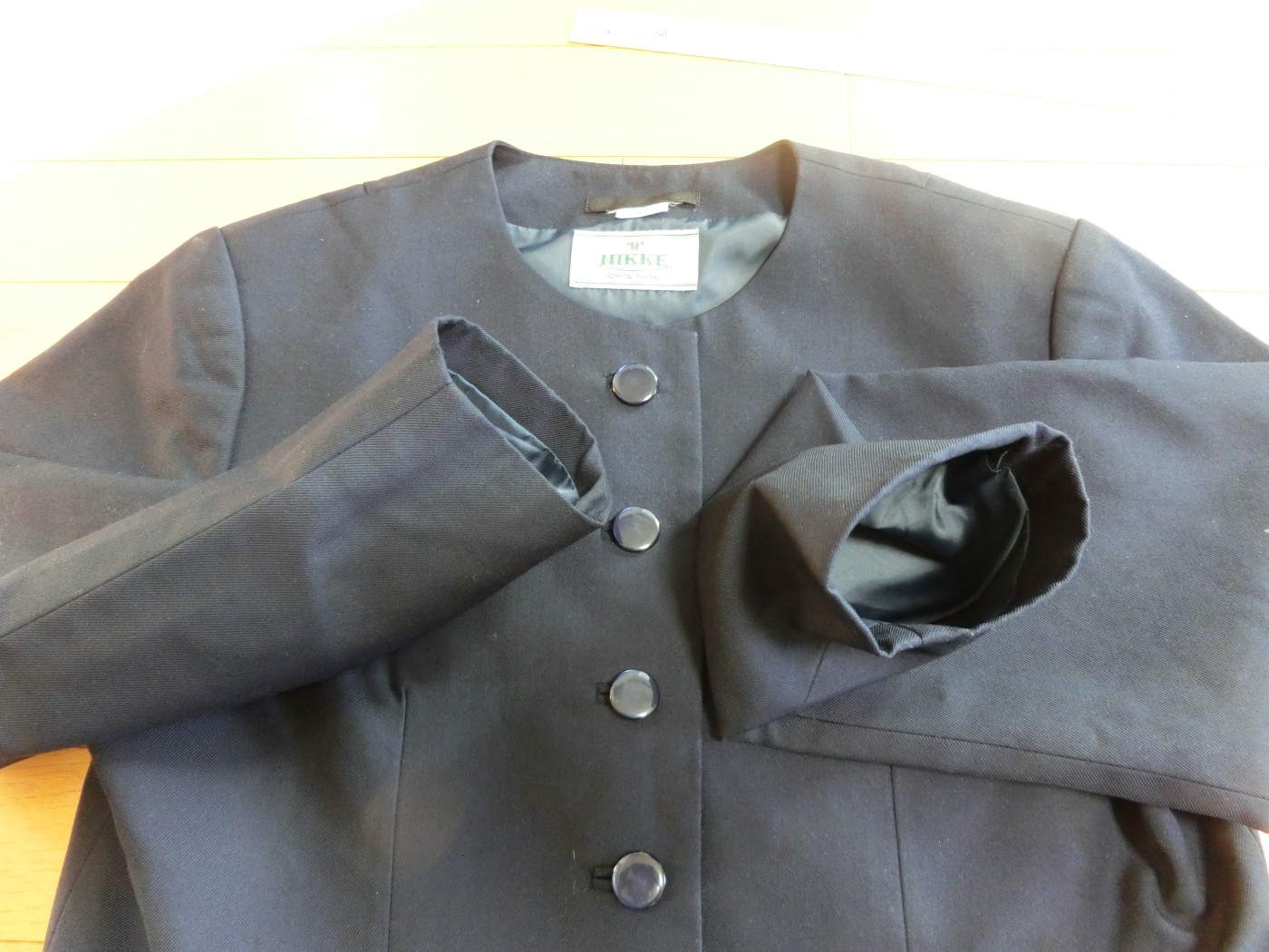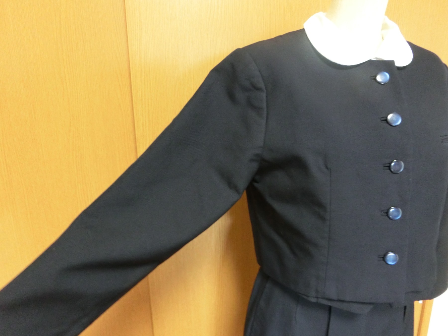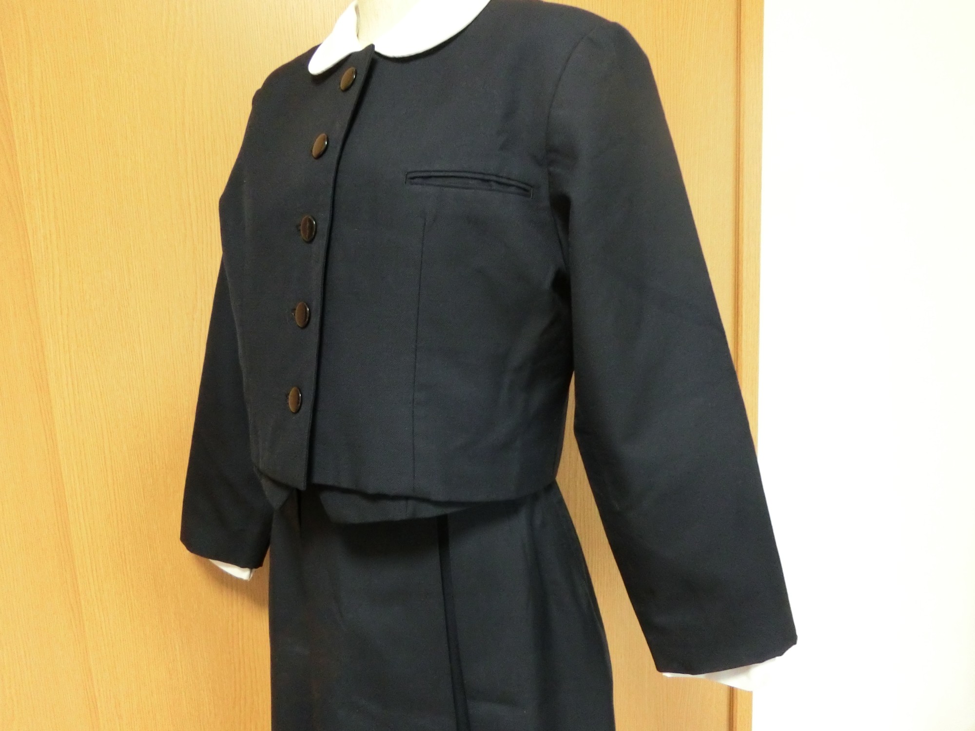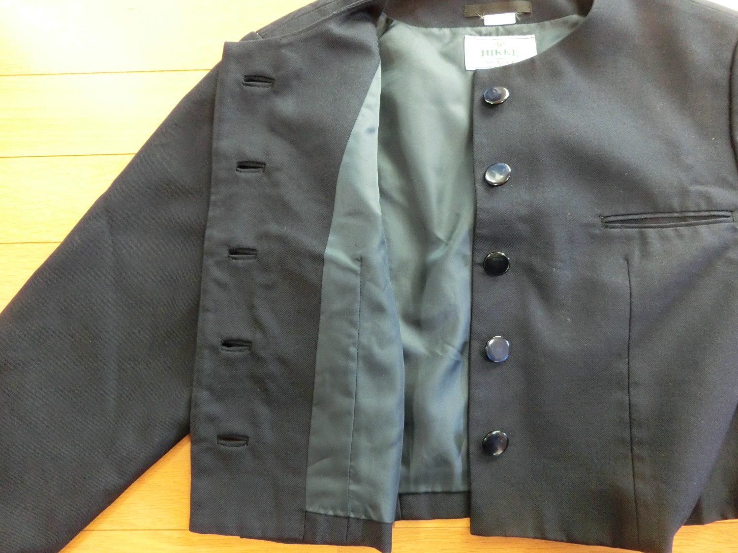 種類でいうと襟なし丸衿ぐり 前あきがボタンどめのカーディガンジャケット ボタンホールが玉縁で、袖がブレザーで一般的な2枚袖でなく1枚袖です