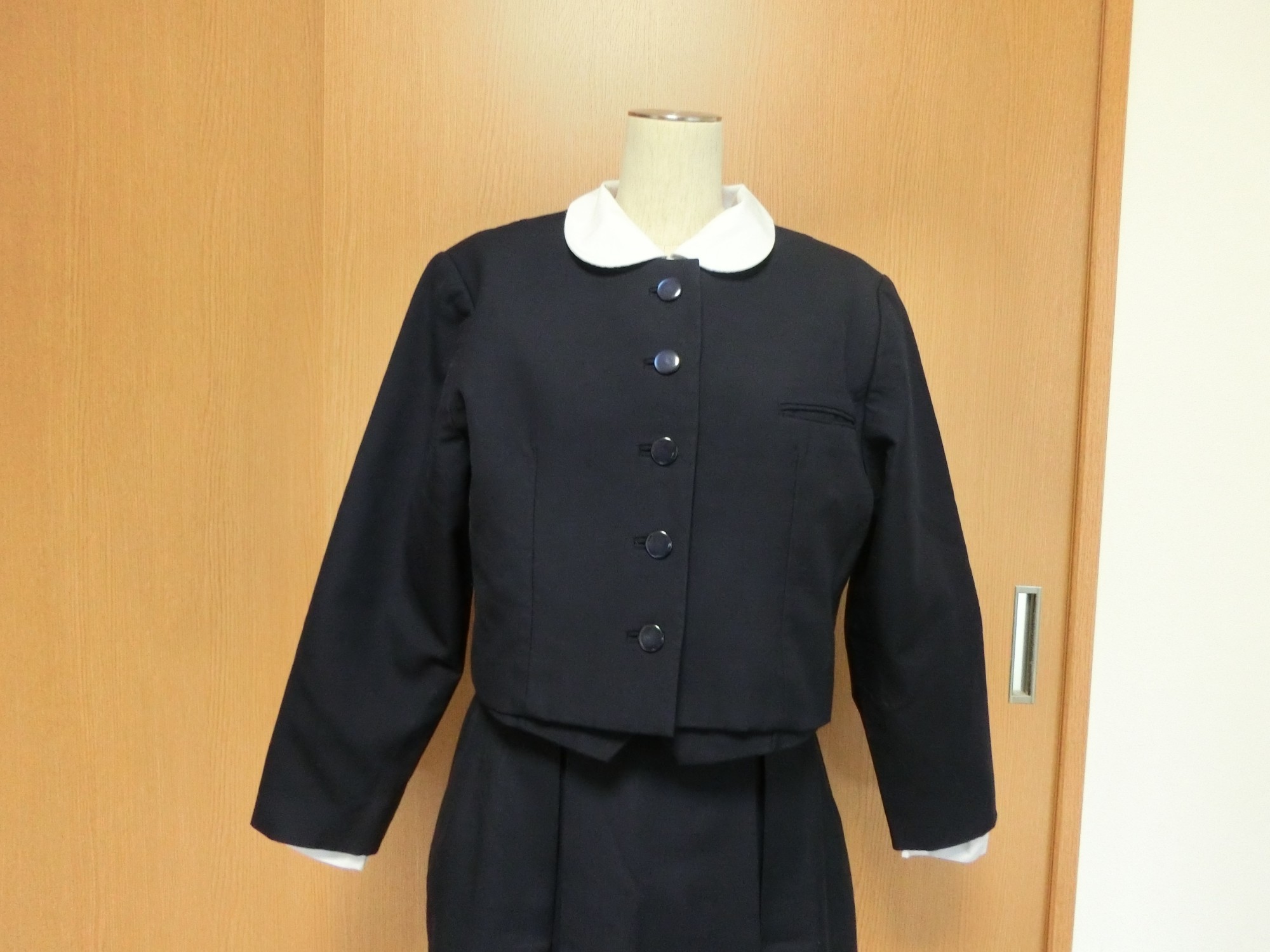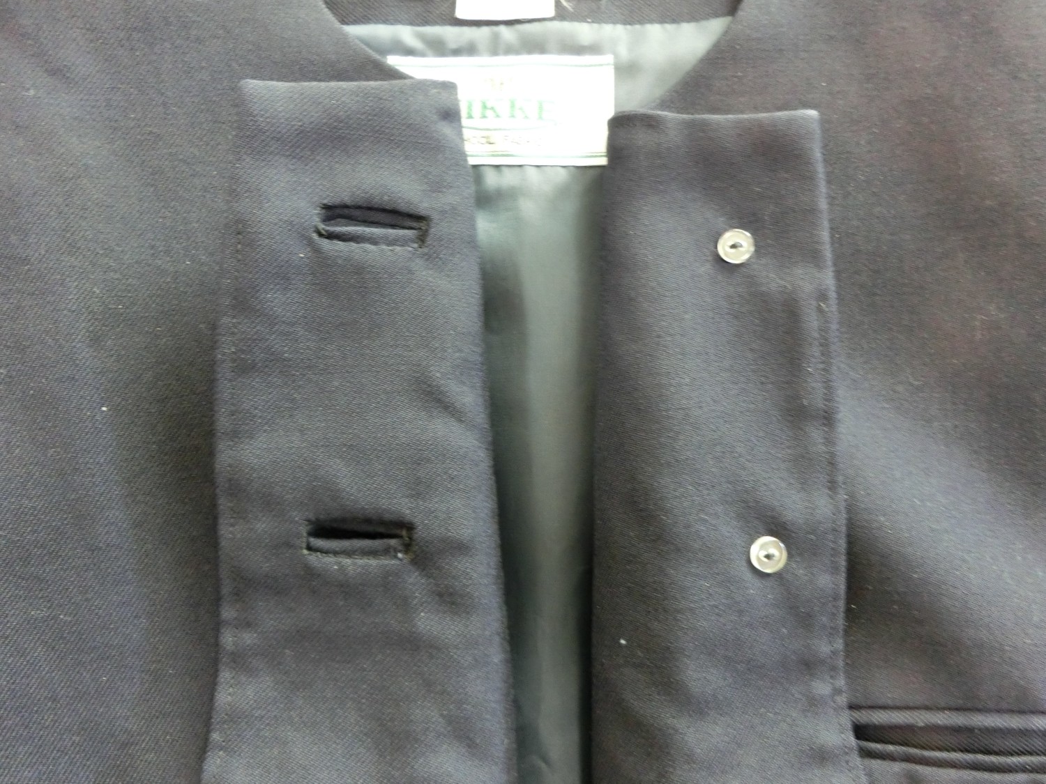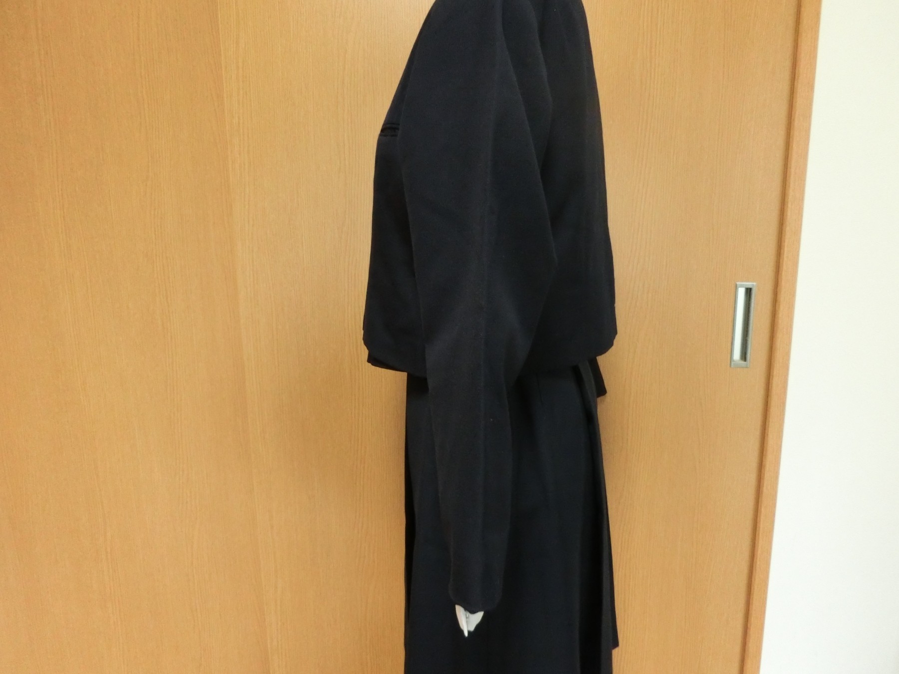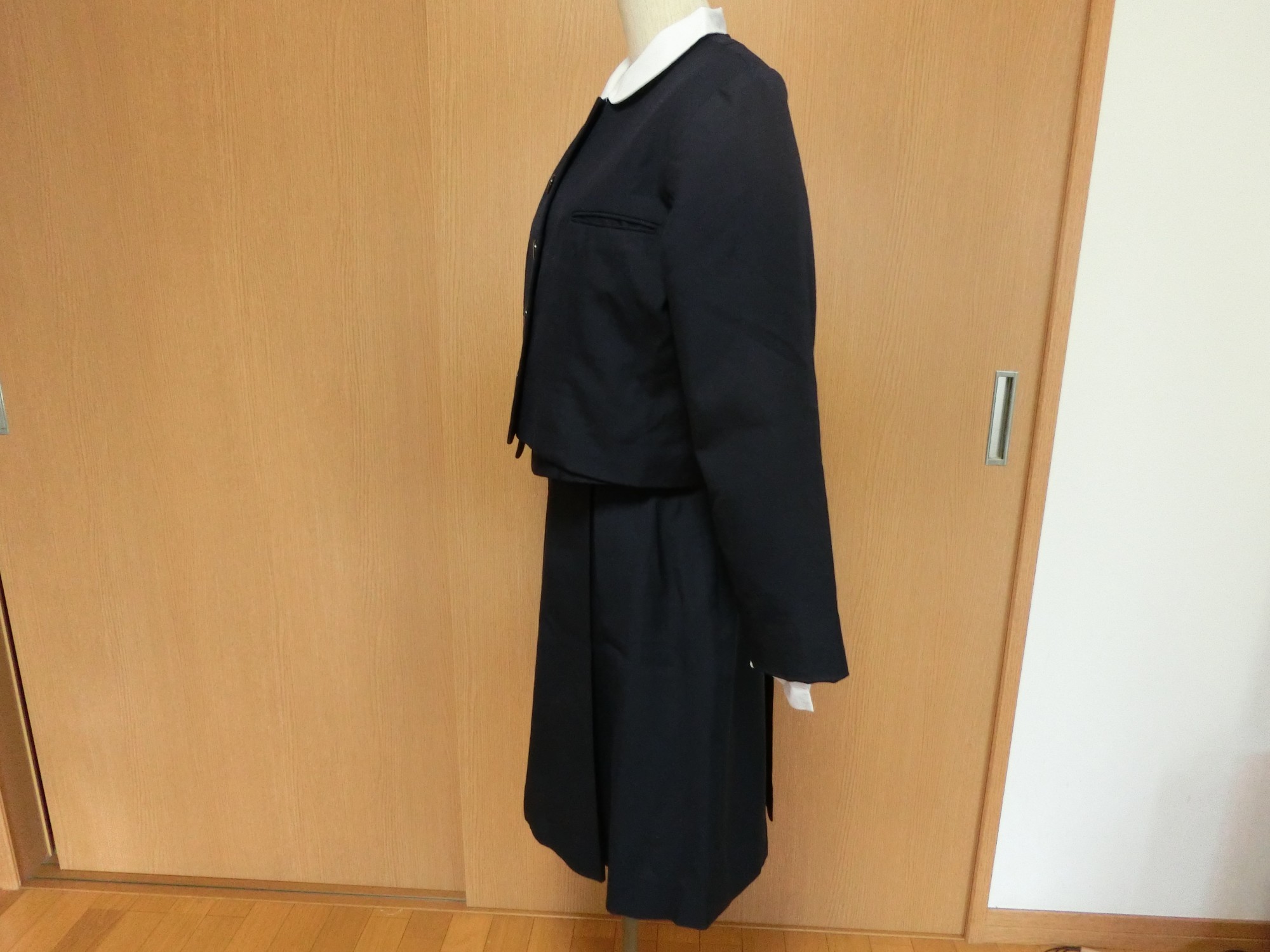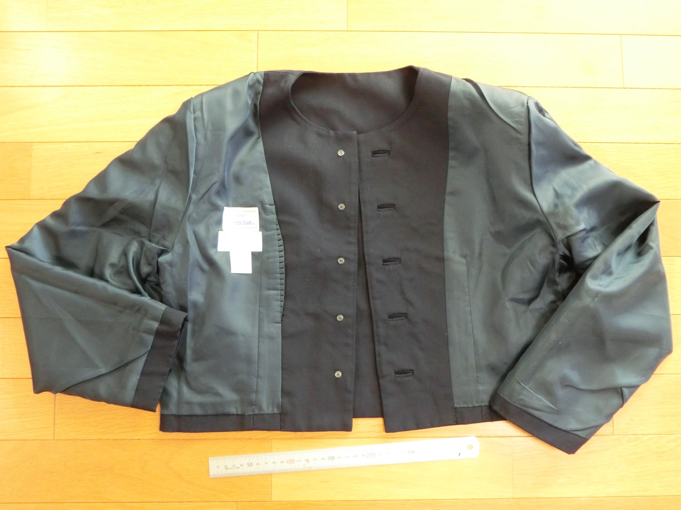 種類でいうと襟なし丸衿ぐり 前あきがボタンどめのカーディガンジャケット ボタンホールが玉縁で、袖がブレザーで一般的な2枚袖でなく1枚袖です