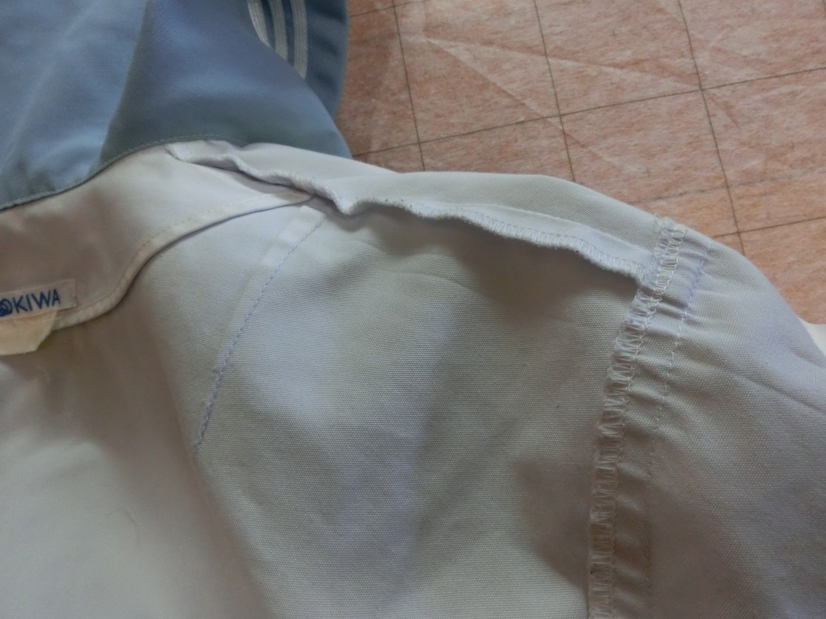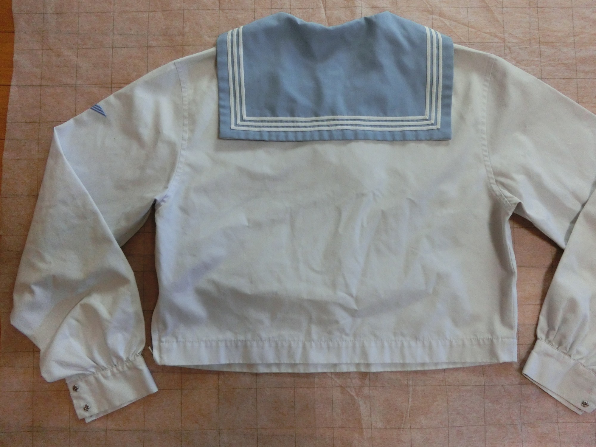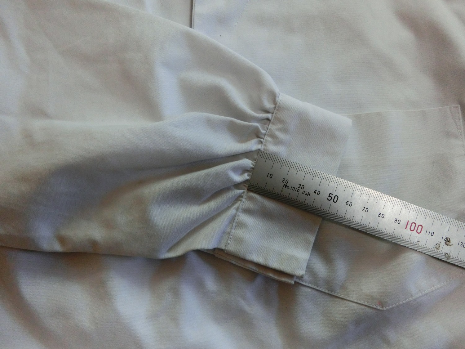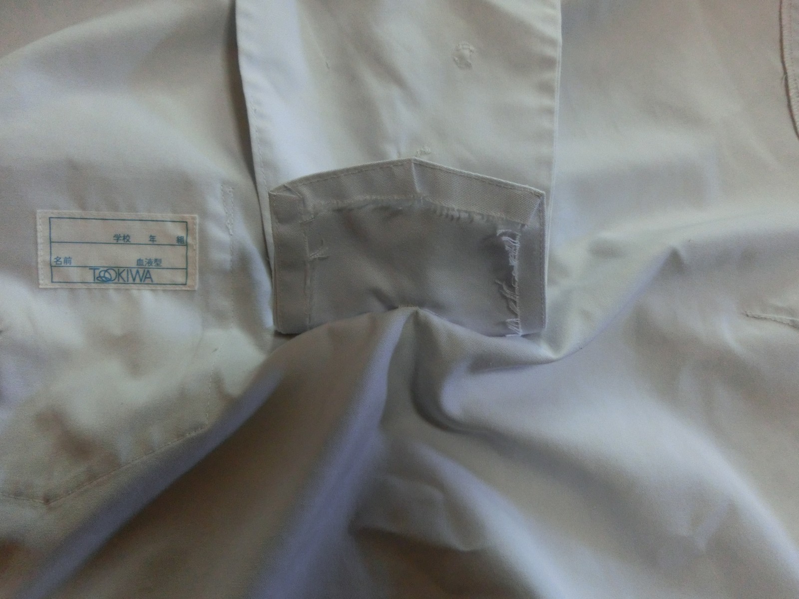 カフスは見頃と同じ白地でギャザーで袖口を縮めています 左袖に刺繍が入ってます