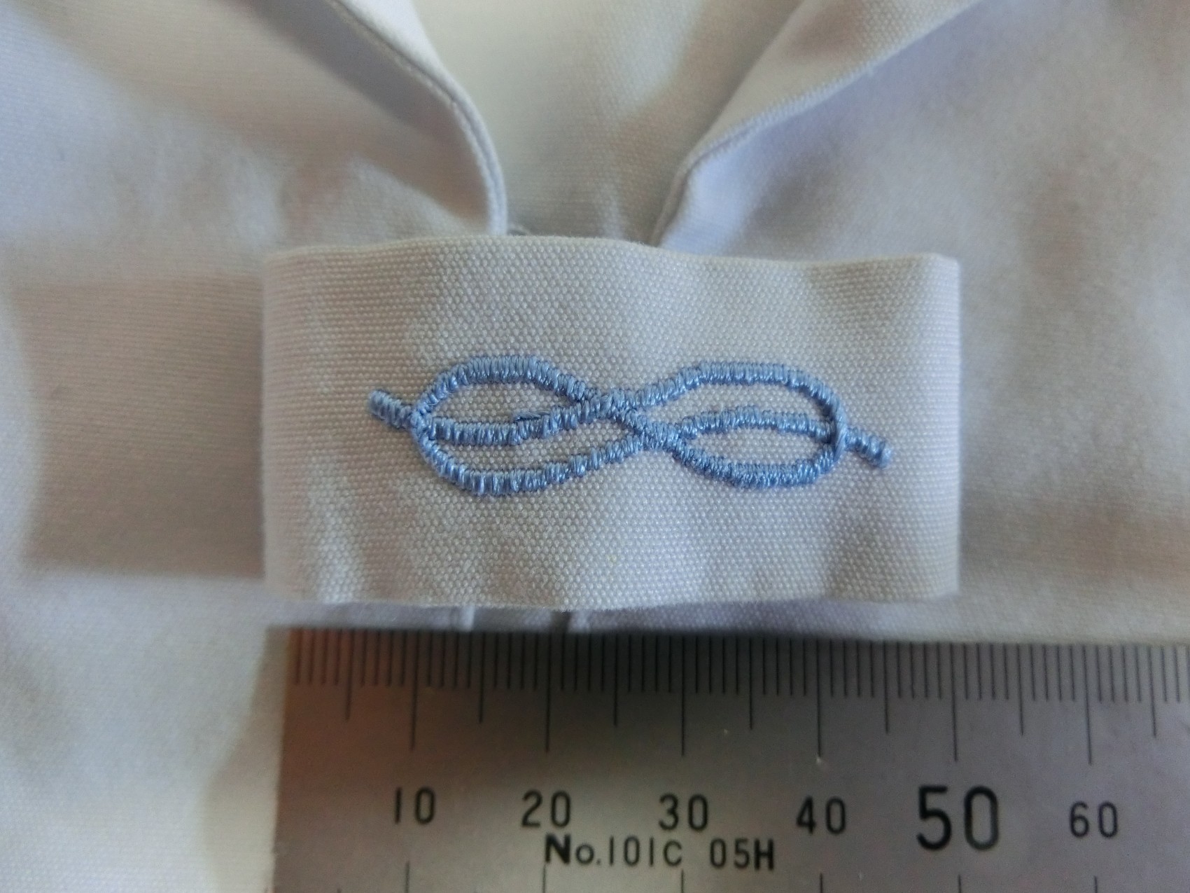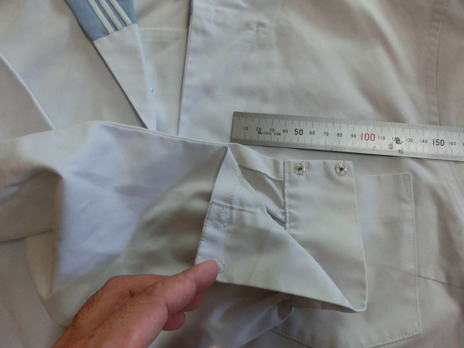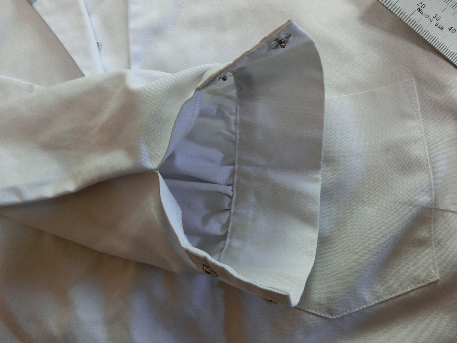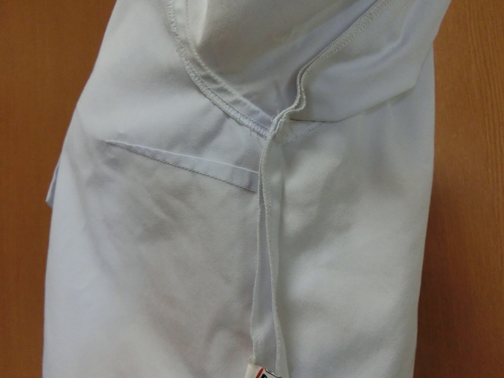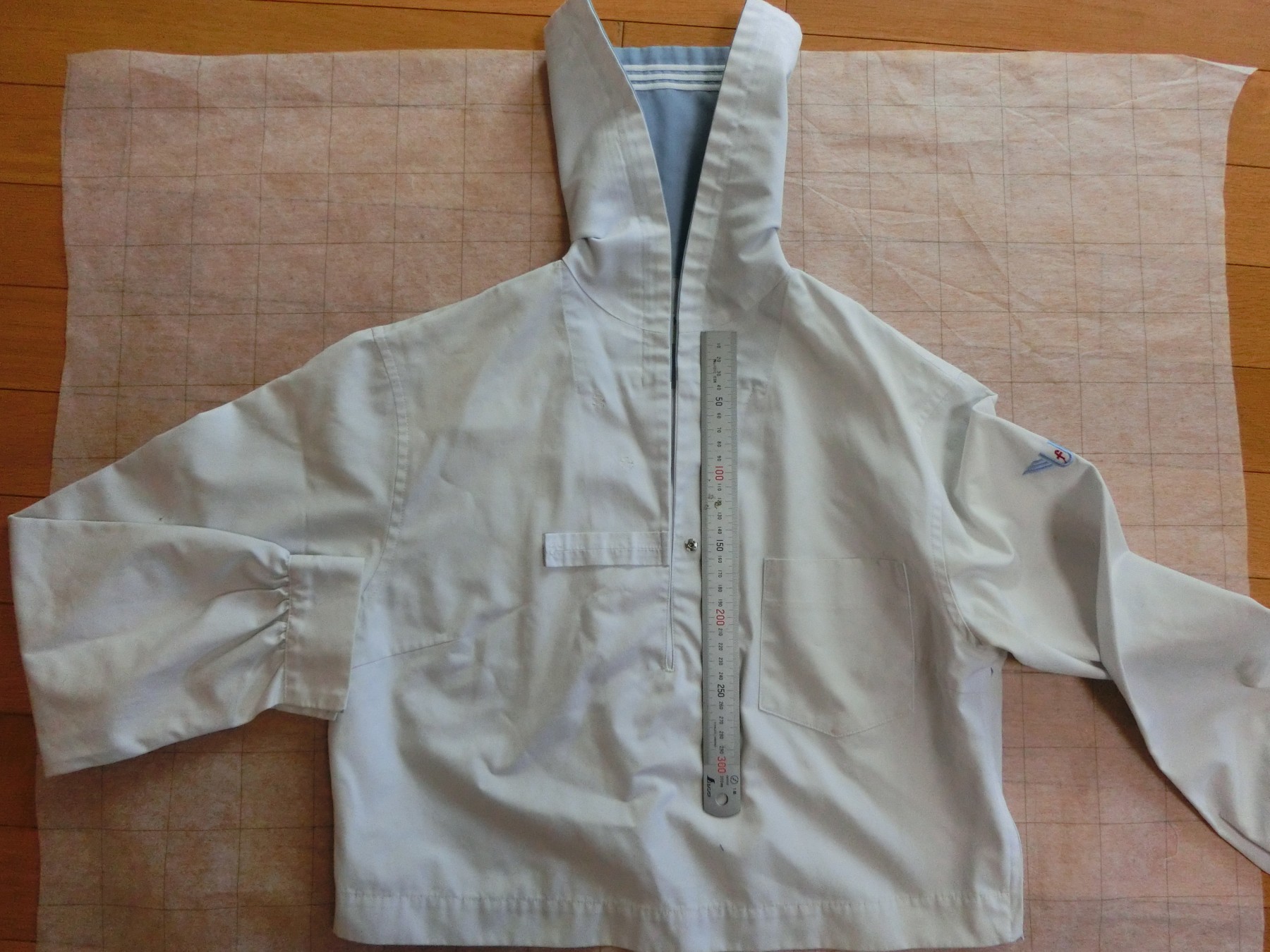 カフスは見頃と同じ白地でギャザーで袖口を縮めています 左袖に刺繍が入ってます