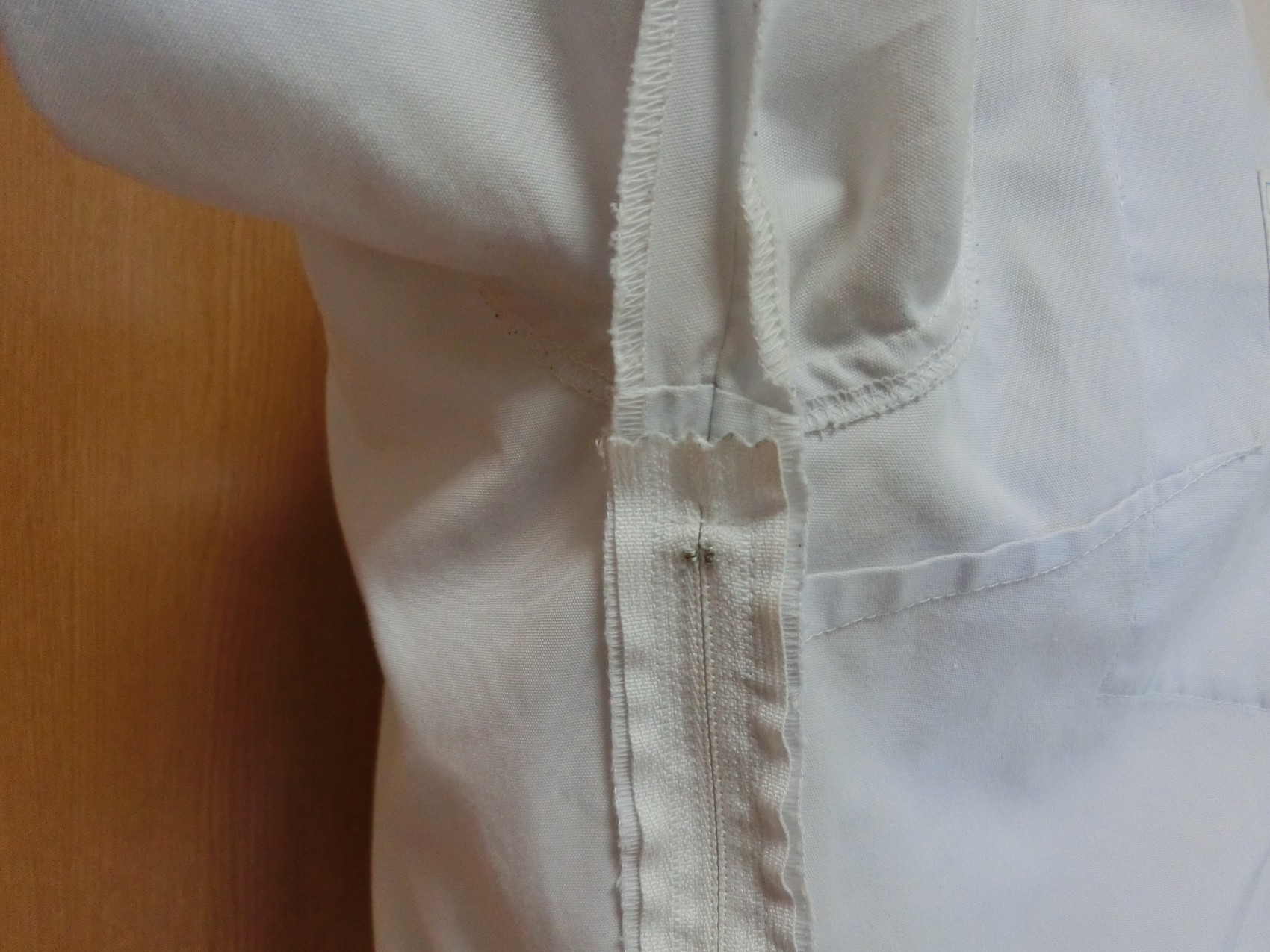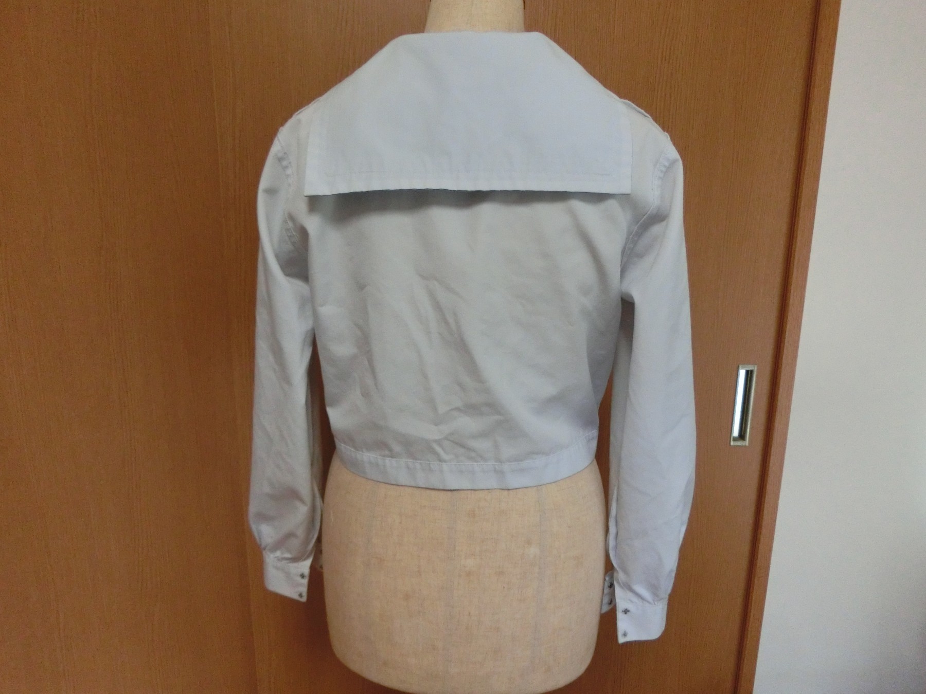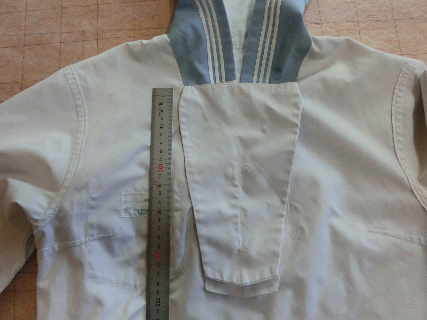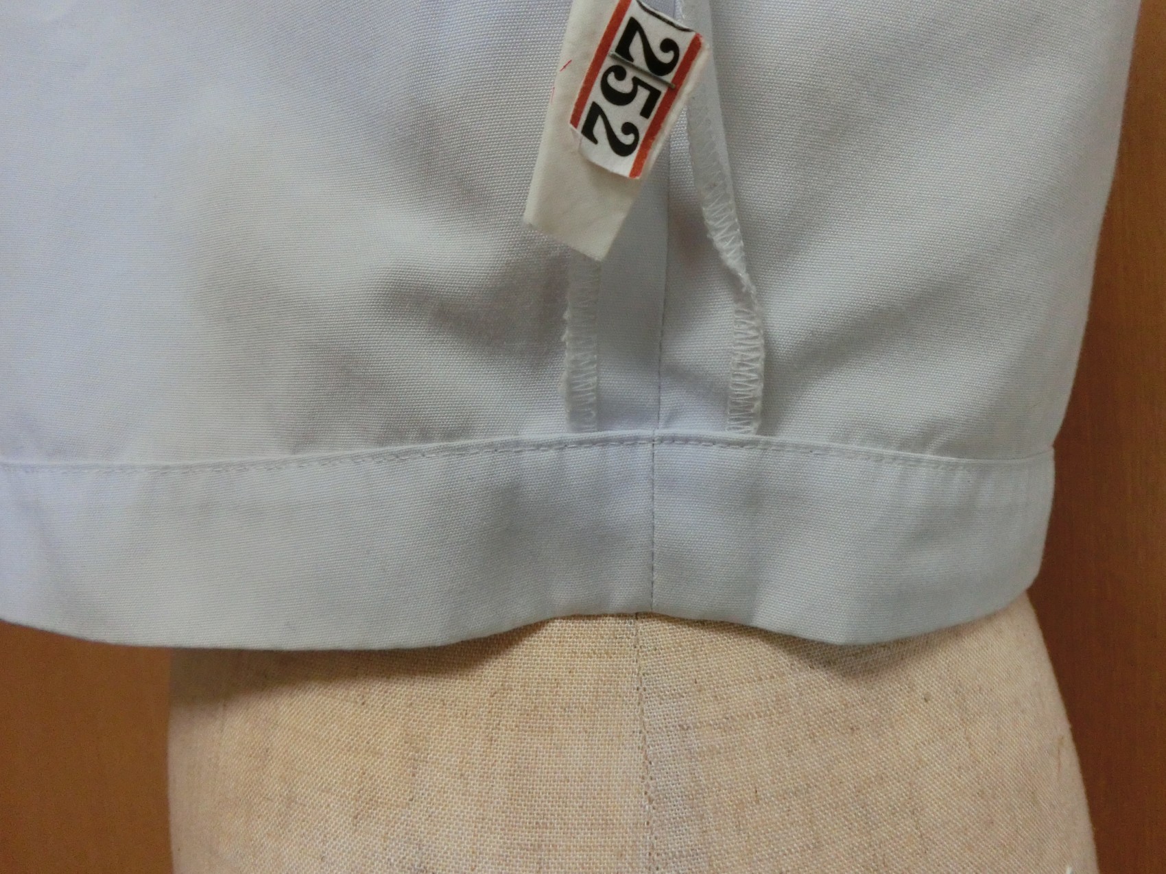 カフスは見頃と同じ白地でギャザーで袖口を縮めています 左袖に刺繍が入ってます